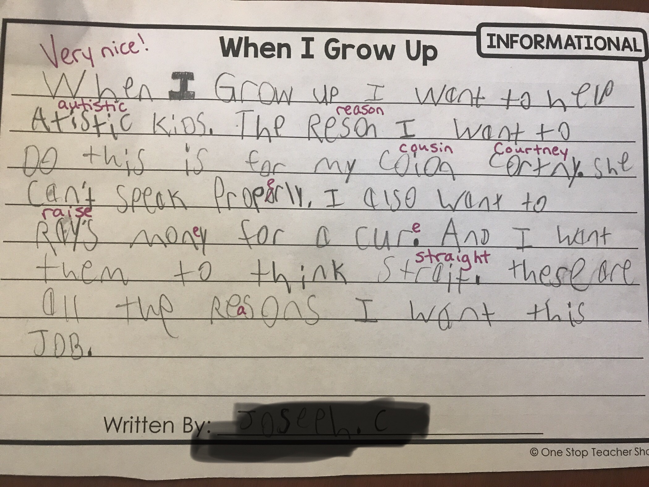 While celebrating Thanksgiving with one side of the family, one family member shared with me that Courtney’s cousin wrote about her at school. She shared his writing with me. I had to hold back my tears as I read about how he wants to help autistic children like his cousin when he grows up. How beautiful! And I can see him actually sticking to that! He is so good with Courtney. He spent the whole gathering making sure she had her talker with her. It is so cool to see her already inspiring others.Oh Courtney, you are so loved by many!