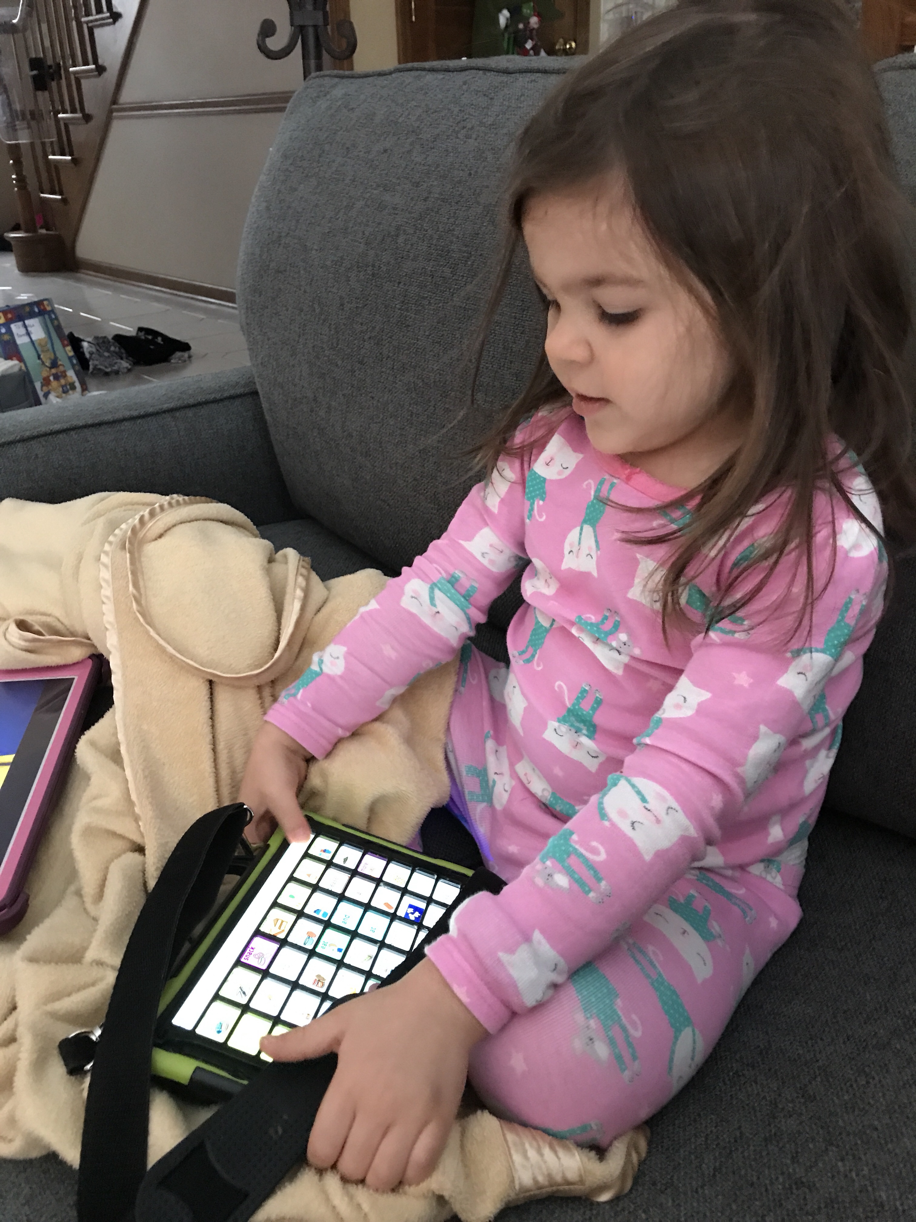 It’s been just over a year since we embraced the journey of Assistive Technology with Courtney and I feel like she is finally starting to own it. Meaning she is now starting to understand that she needs her talker to get her needs met. She is starting to independently carry it from one room to the next with out us telling her to bring it. She’s using it to request her favorite foods, toys and even some actions. She is even starting to use to to label items and colors! Today I watched her use her talker to ask her nanny to scratch her arm. I wanted to cry. Courtney can talk! Is it the way you and I talk? No, but that doesn’t matter one bit. She has words!