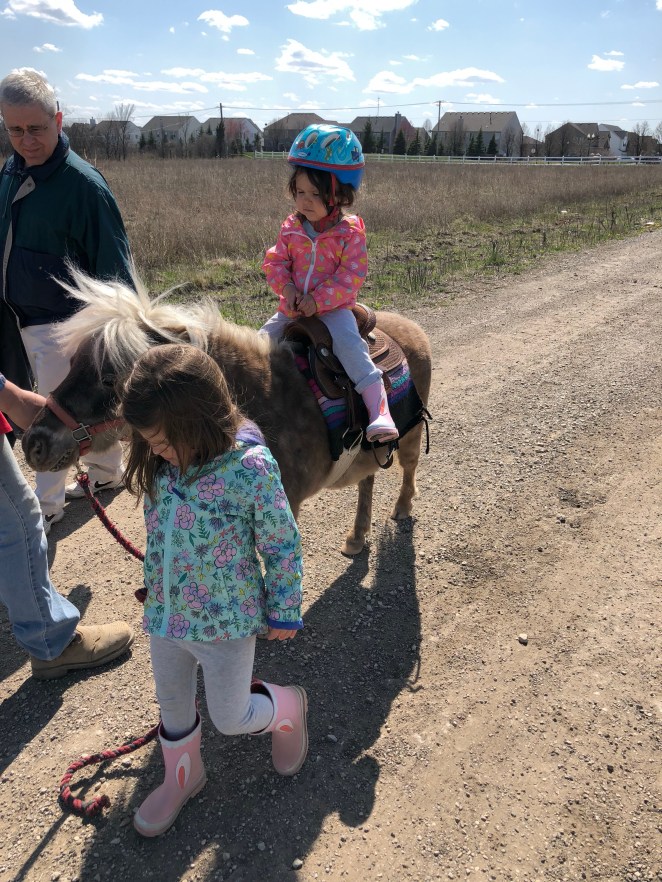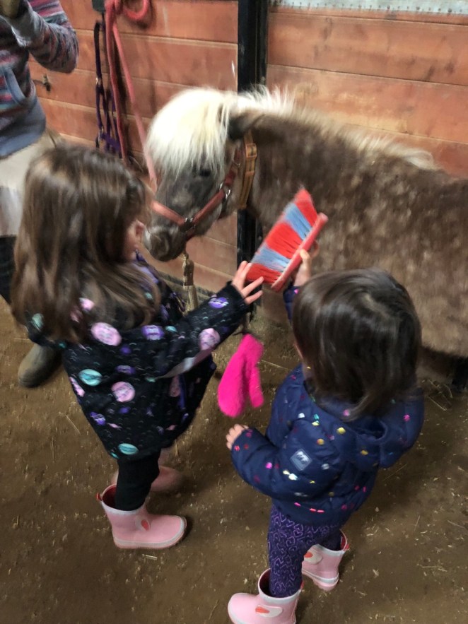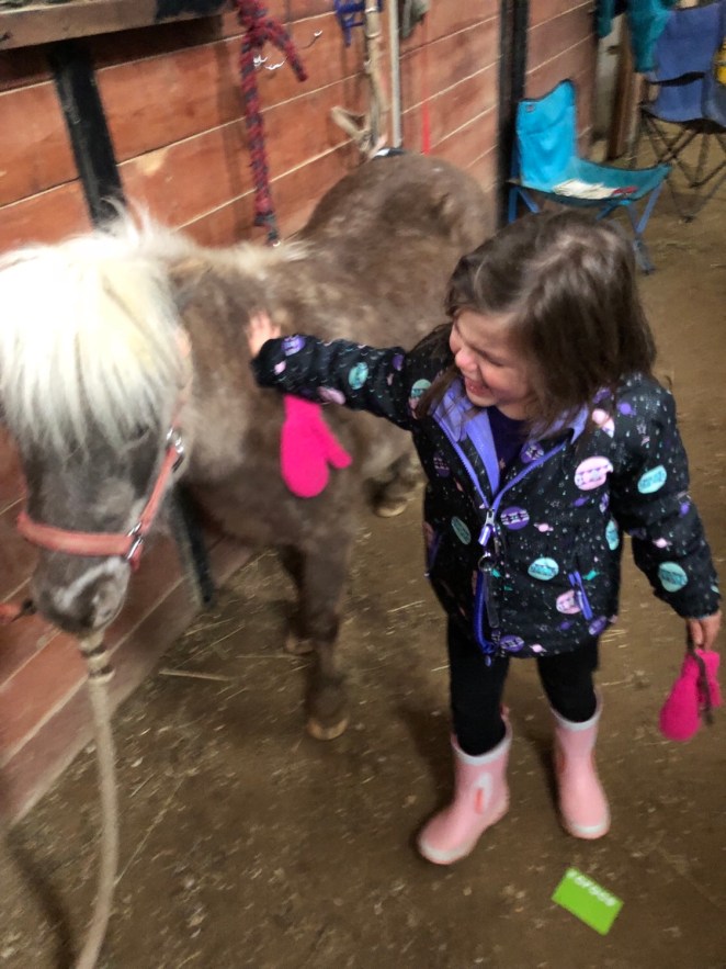 There is no pressure at therapy. Alyssa got on the pony the first session. Now 4 sessions in, she looks like a pro. She asks all week long, “go see my Bumble (the pony’s name)?” Courtney is still very uncertain about the horses and has yet to get on but each session she’s becoming more comfortable around them. One of the sessions we even heard her say Bumble!