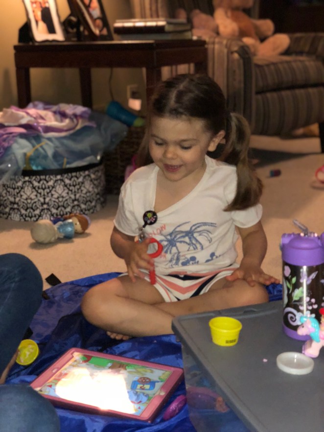 I think the thing I have the hardest time with when it comes to Courtney is her struggle with peer interactions. I think I struggle even more now with it than ever as I watch Alyssa make friends and talk about them on a daily basis. Now Alyssa’s friends are mostly her cousins and then her friend Kayla, but she asks for these friends daily. Does she ask for these friends daily because she doesn’t have anyone playing with her at home? For the most part, Alyssa and Courtney do their own thing when playing at home. Alyssa is usually making up the cutest play schemes in her kitchen or with her princesses and baby dolls while Courtney is in another room labeling colors, numbers and animals or looking through books. They do occasionally like to rough house with each other which I always enjoy watching. I do work on them playing next teach other but it’s usually short live.