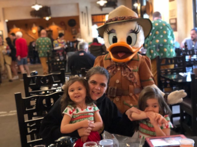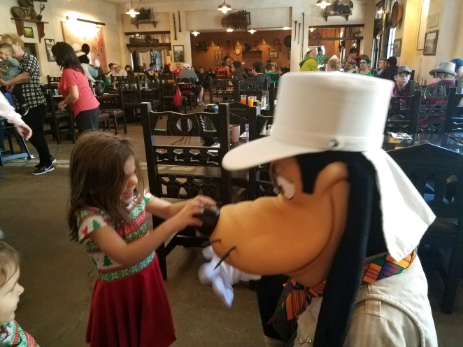 The moment was so clear of for us when that pixie dust was sprinkled. Goofy had visited our table at a moment that Courtney was so overstimulated. Because of that he moved on to the next table. Other characters stopped by. She wasn’t too keen on them either. Alyssa was of course cautiously soaking in all the fun as the characters visited. Courtney finally calmed down and are meal was over. We can tell Goofy was making his rounds again so we decided to wait. We are so glad we did.
