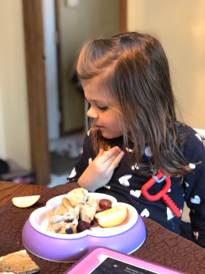 Our amazing feeding therapist (yes, I said “our”, not “Courtney” because honestly these therapists help the entire family) mentioned to me the importance of Courtney seeing what we are eating and being exposed to different foods. If we were eating at the same time as her I would put a small bite of our food on her plate but as we did less and less eating together that happened less. As of recent, our feeding therapist approached me about her doing some therapy in our home. She encouraged a family goal of eating together AT THE TABLE. Yes, this made me very anxious because I knew the effort it would take to change our normal, but the idea of having a meal as a family was appealing.