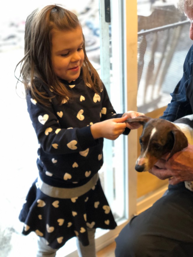 “Can you say, Junior, Courtney,” asks Grandpa as they are petting their dog, Junior.