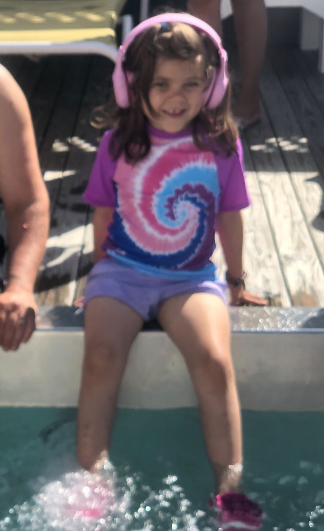The running water is because of her noise sensitivity and we are finding ways to work with that. The fear of water above her knees? We are pretty sure it has something to do with the loss of control she feels when her feet can’t touch the ground. We can even hold her in the water. She struggles with swings for the same reason. Her feet are not grounded. The girl can climb all heights but when she loses that sense of gravity because her feet aren’t grounded, forget it!