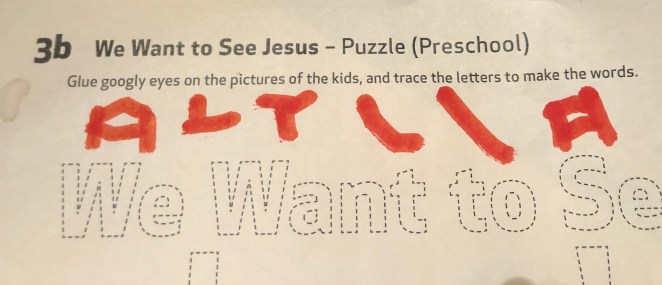 When Alyssa showed me a coloring page from Sunday school that had her name written on top, I immediately assumed one of her cousins who goes to Sunday school with her wrote it. She can’t write her name! But then looking at it closer, it didn’t look like her cousins (6 and 8 years old) did it either. I asked Alyssa and she said she did it. I Still thought it wasn’t possible. She doesn’t know how to write her name and nor could she have already learned how to that fast in preschool.