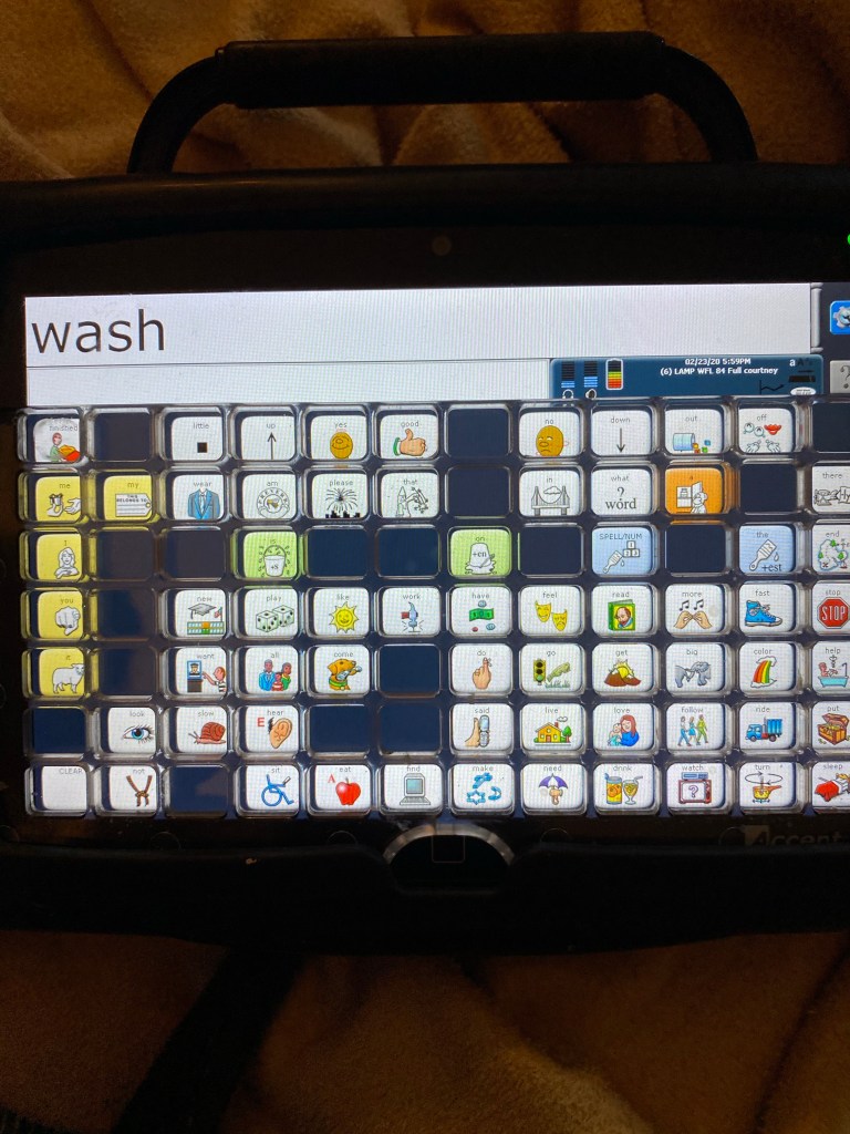 The other day Courtney kept grabbing me and bringing me to the master bathroom’s bathtub. I grabbed her talker and asked her what she wanted. She carefully scanned the pictures and pressed “wash”! Oh my goodness! She told me she wanted a bath! Darn right I stopped everything and got the bath ready. Well, she didn’t want a bath, she hates baths. She wanted water in the tub so she can lean over and play in it. That detail doesn’t matter and we will work on that, but it’s a start!