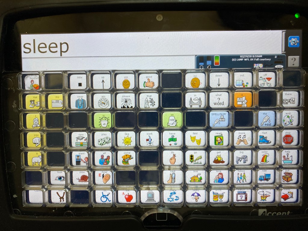 This morning we were playing downstairs and she grabbed her blanket, iPad and grabbed my hand and brought me to the stairs. I went back and grabbed her talker and asked her what she wanted. She scanned her talker with intent and then requested “sleep”. I know she didn’t want to actually go to sleep, but she loves sitting on my bed and watching her ipad so I was able to figure out what she meant. Again, a novel request that does not involve food!