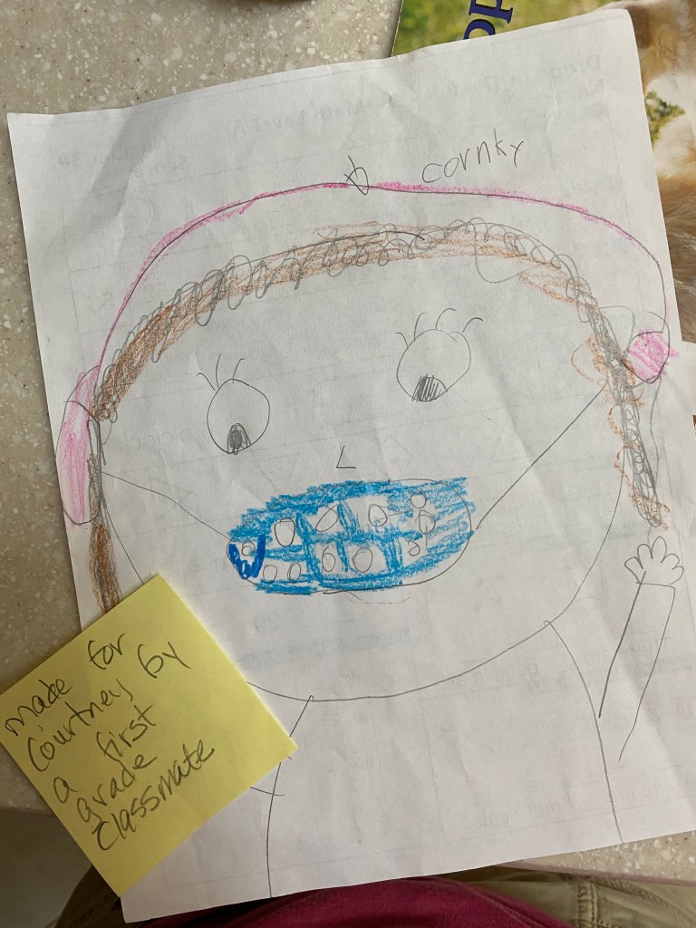 Every day this week I waited for that message that said she couldn’t handle it, but each day I heard the opposite. Courtney did well. Courtney was happy in the other class. Courtney did ask to “go” early but did well while she was in there. Then on the 4th day in her bag was this beautiful portrait with a sticky note that said, “made for Courtney by a first grade classmate”. This picture captured Courtney beautifully! Her brown hair, her big eyes, her pink headphones, the blue and white polka dot mask that sits below her nose. My heart melted.