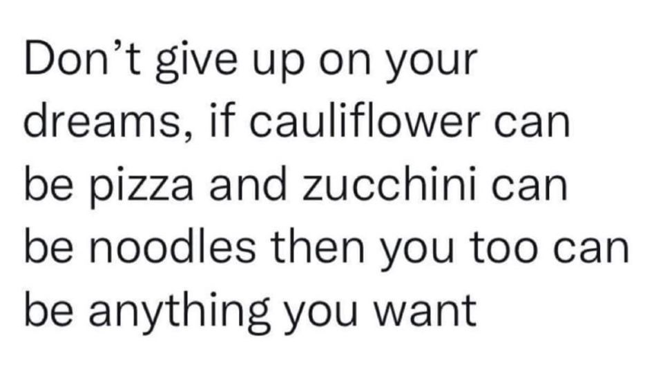 Today my brother shared the quote in the picture. “Don’t give up on your dreams, if cauliflower can be pizza and zucchini can be noodles then you too can be anything you want.”