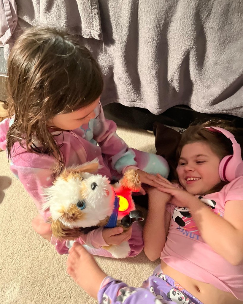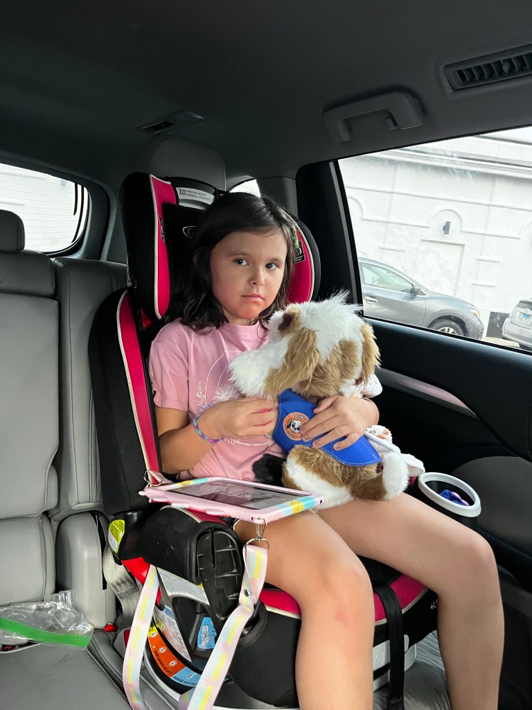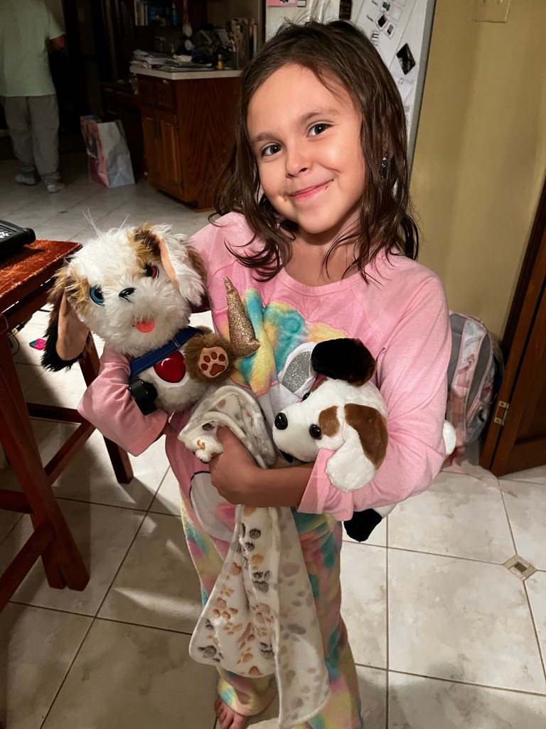 Since that evening, Alyssa has asked me to bring Bouncy home from school every night. He spends evenings and weekends at home with us. He sleeps with her at night. He has become a part of our family. She adopted one of the plush dogs that the program offers and named her Bounce. Bouncy has gone to family events, outings and park district activities. Whenever she feels anxious she knows she just has to press his heart. Bouncy has not only decreased the length of her anxiety attacks but the frequency of them too.