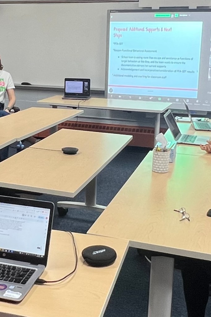 I also wasn’t expecting the emotions I felt when sitting at the table and seeing all who support Courtney gather together. Since we have seen an increase in behaviors across all settings I also made sure as much of her home team was involved in this discussion too. This included her BCBA, her private speech therapist, Savannah and our advocate. 12 people in one room (this does not include all the private therapists and para professionals that support her). 12 people who had one goal. Helping Courtney make progress in the safest way possible. I was so moved.