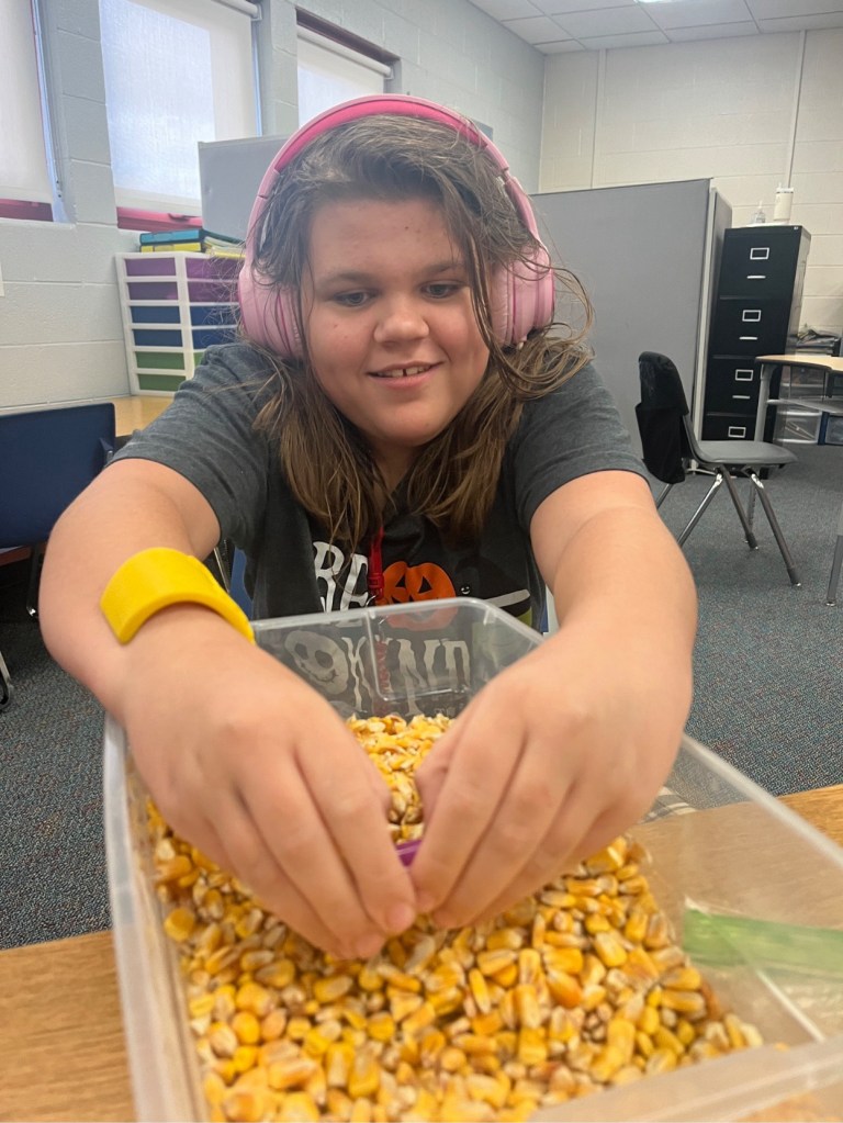 (Picture of Courtney enjoying a sensory bin on Halloween at her current school.)